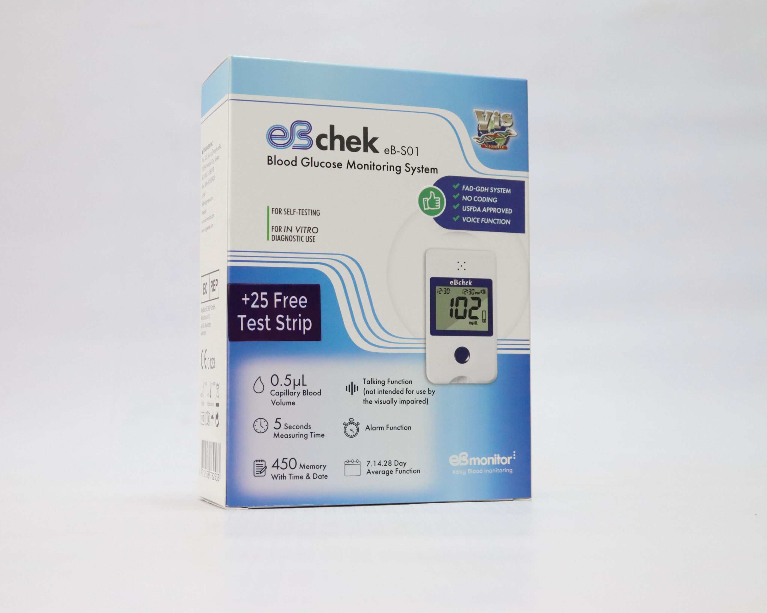 The eBchek Blood Glucose Meter is an innovative, Code-Free, reliable, and user-friendly device designed to simplify diabetes management with a FAD-GDH enzyme mechanism to minimize oxygen interference and keep you updated with results you can trust.